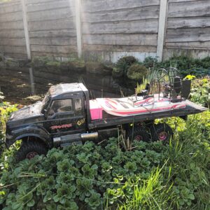 This is the RC that puts the biggest smile on my face, it is so much fun to use and it looks fantastic on the back of my Traxxas TRX6 Hauler. The hauler bed is smooth so the boat can drive right off and into the water, no need to lift it off, driving it back on also works but is much more tricky. The boat is very fast and leaves a spray of water behind it making a noise similar to a prop aircraft. At full speed when you apply full rudder the boat almost turns on the spot creating a splash and a huge spray of water.